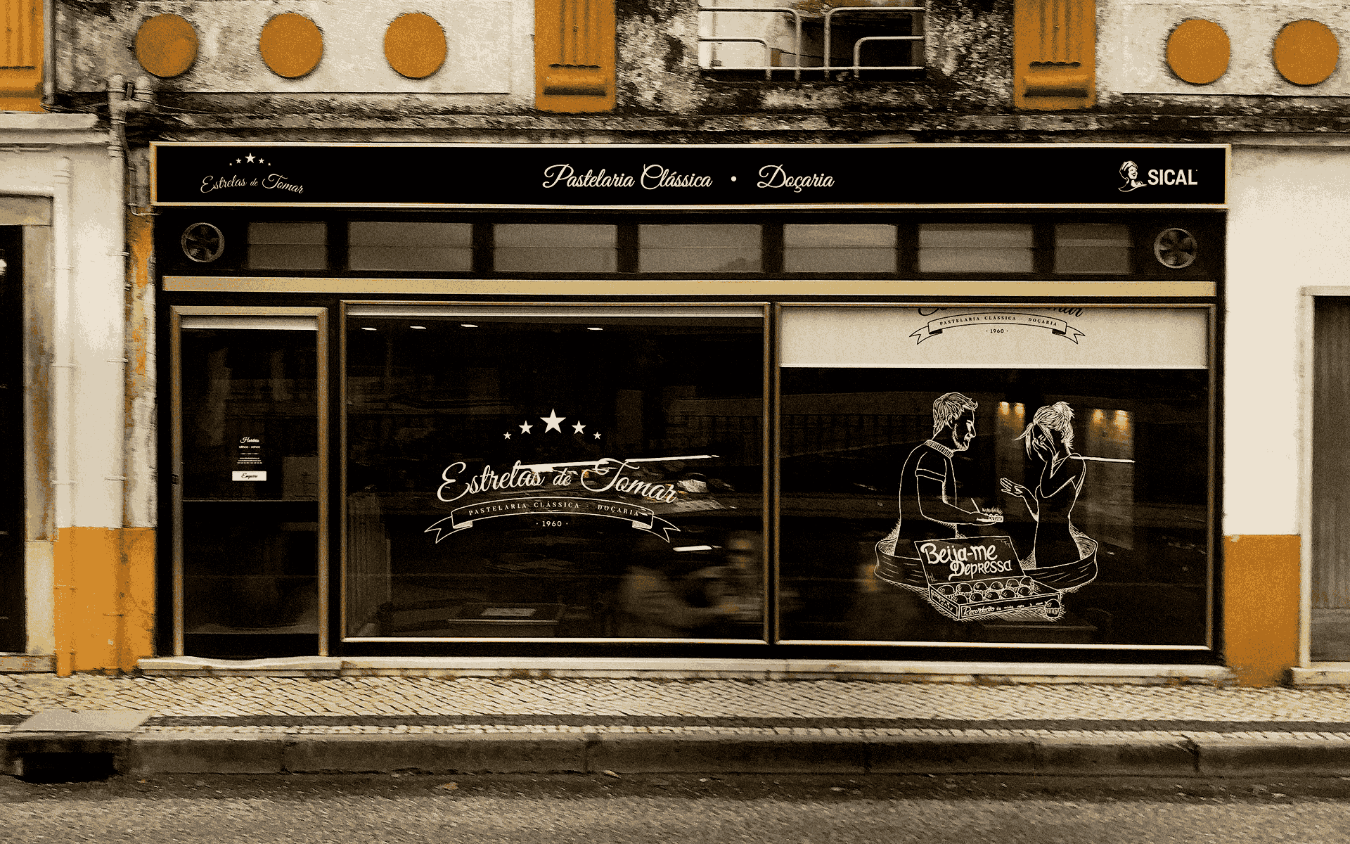 Before colours or sketches, we immersed ourselves in the stories that make Estrelas de Tomar’s heart beat, stories of people, encounters and legends, such as that of “Beija-me Depressa” (Kiss Me Quickly): a simple gesture that became a sweet and eternal metaphor. This narrative was the guiding thread of the project, inspiring shop windows, vans, graphic materials and digital presence.