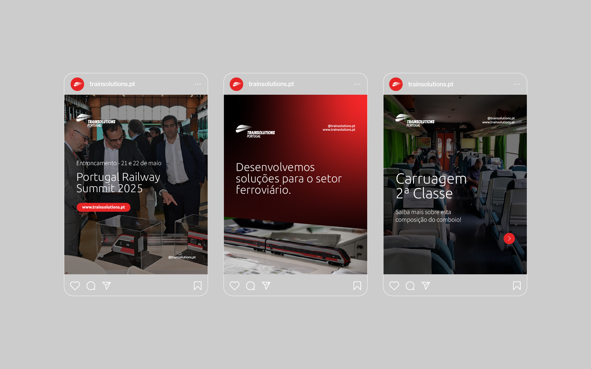 We developed a variety of communication support materials, from event materials (banners, roll-ups, physical supports) to digital and institutional content. The visual coherence across all material reinforces the professionalism, seriousness and impact of the TrainSolutions Portugal brand.